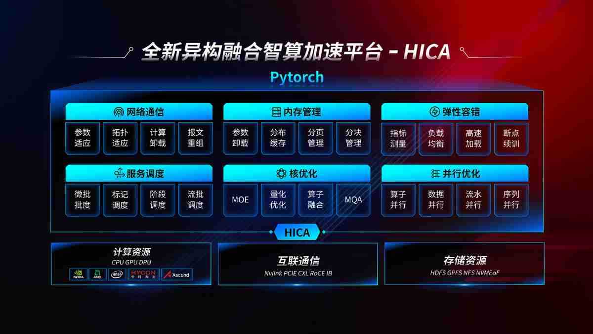 通过自研的服务层、、中间适配层、、以及调度编排算法,,,采用数据并行、、、模型并行等多种并行方式,,把并行计算任务进行有效的分解,,,使其分别由相应的软件栈和算力资源来承接。。。。当GPU资源变化,,,HICA可以实时动态调度计算子任务并调整模型拓扑和架构,,,以充分聚合各种算力资源。。。