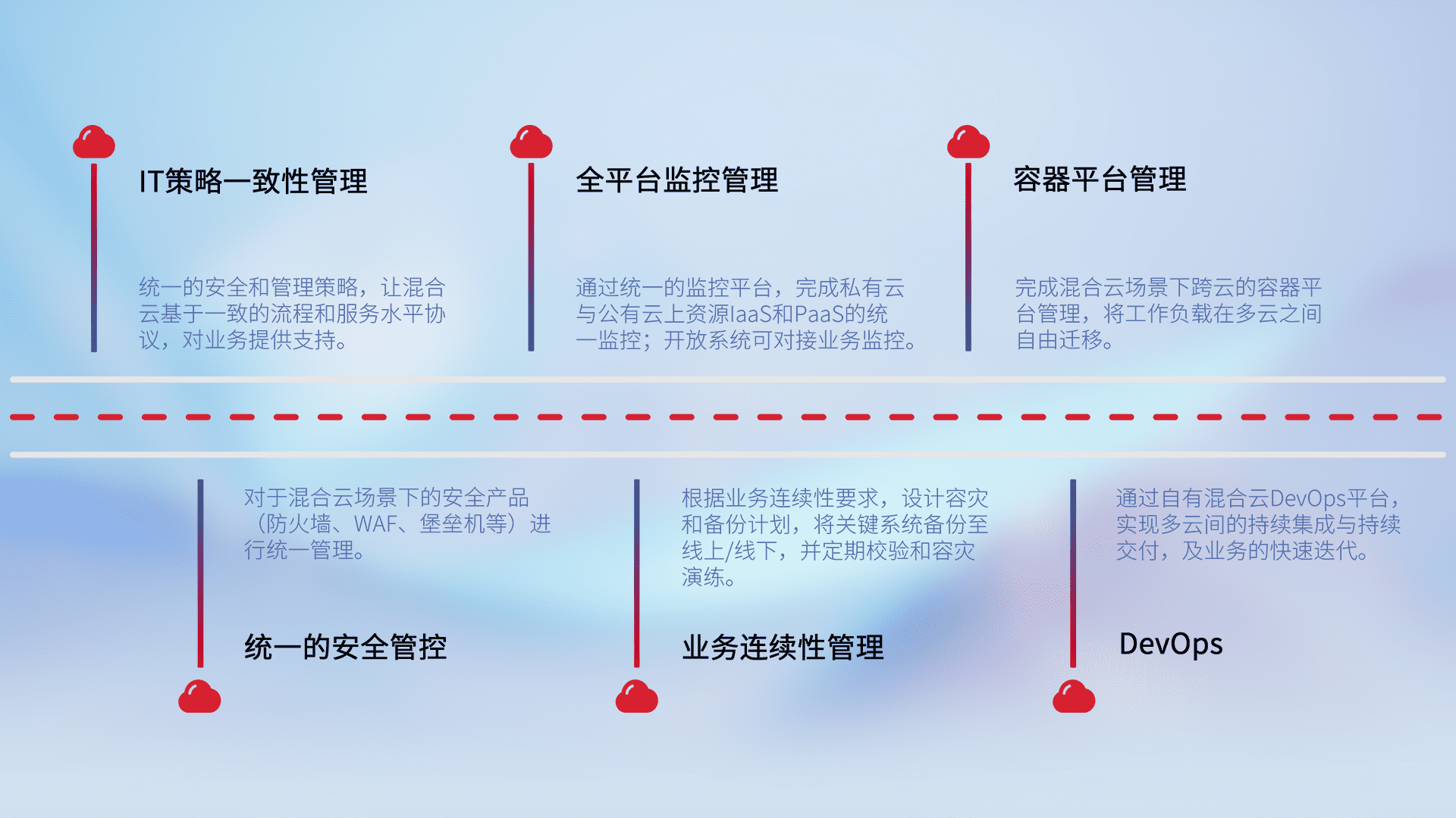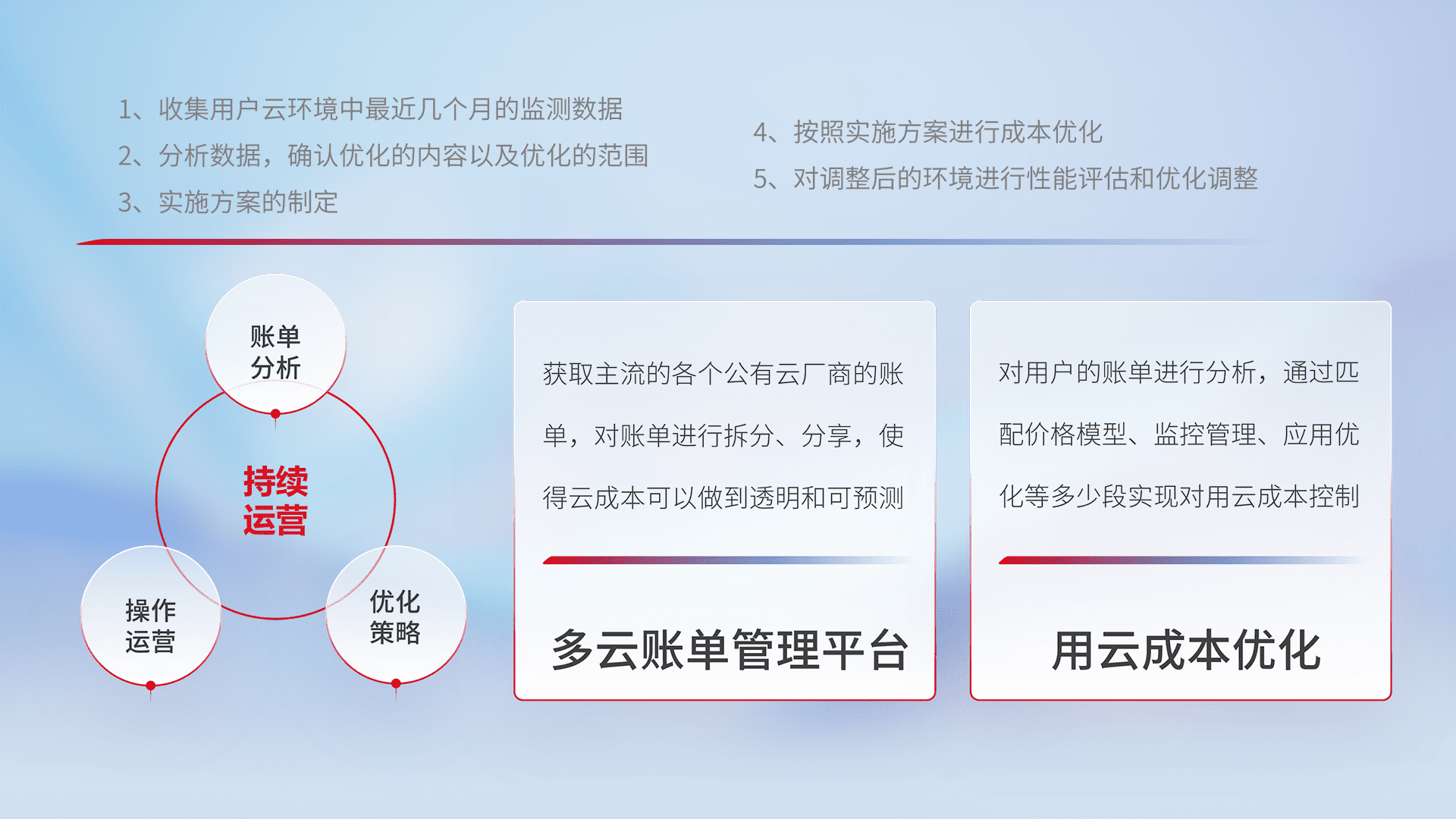 通过多云纳管,,以统一的资源数据模型把客户的云资源进行抽象和封装,,进而实现对多云资源的统一操作,,,保障云资源管理的可靠性、、稳定性与可用性。。。。量身定制化运维内容,,,配置、、、、开发运维、、、、补丁管理、、备份、、监控、、、、认证和访问管理、、、、审计和日常巡检等,,,,保障在用云过程中的可靠度,,,,稳定度以及高可用率。。。。