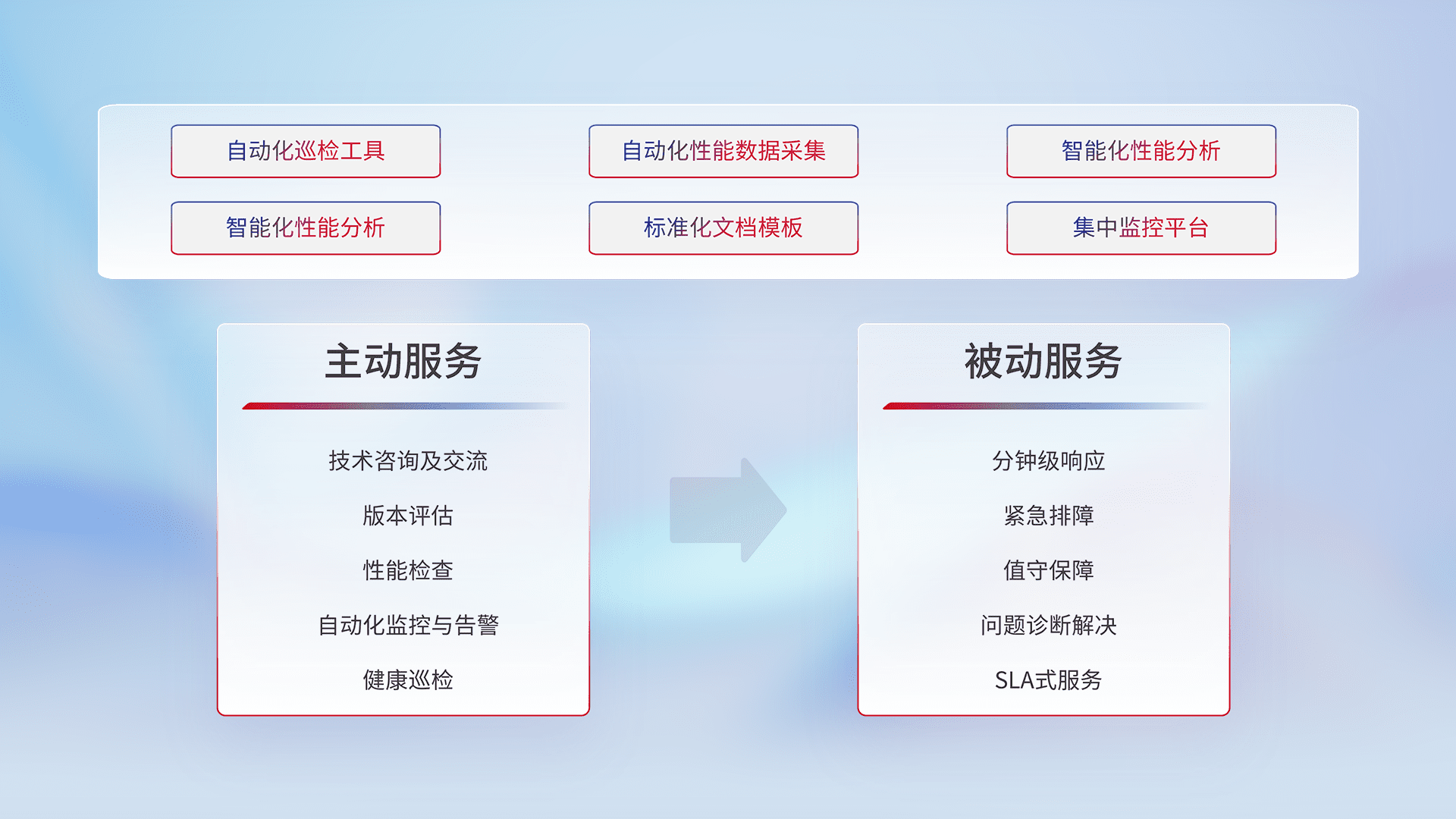 智能化工具和标准化文档,,保障服务质量,,,提供主动服务(包含技术咨询、、、、版本评估、、、、性能检查、、自动化监控与告警、、、健康巡检)和被动服务包含(分钟级响应、、紧急排障、、、值守保障、、、问题诊断解决、、、SLA服务)。。。。