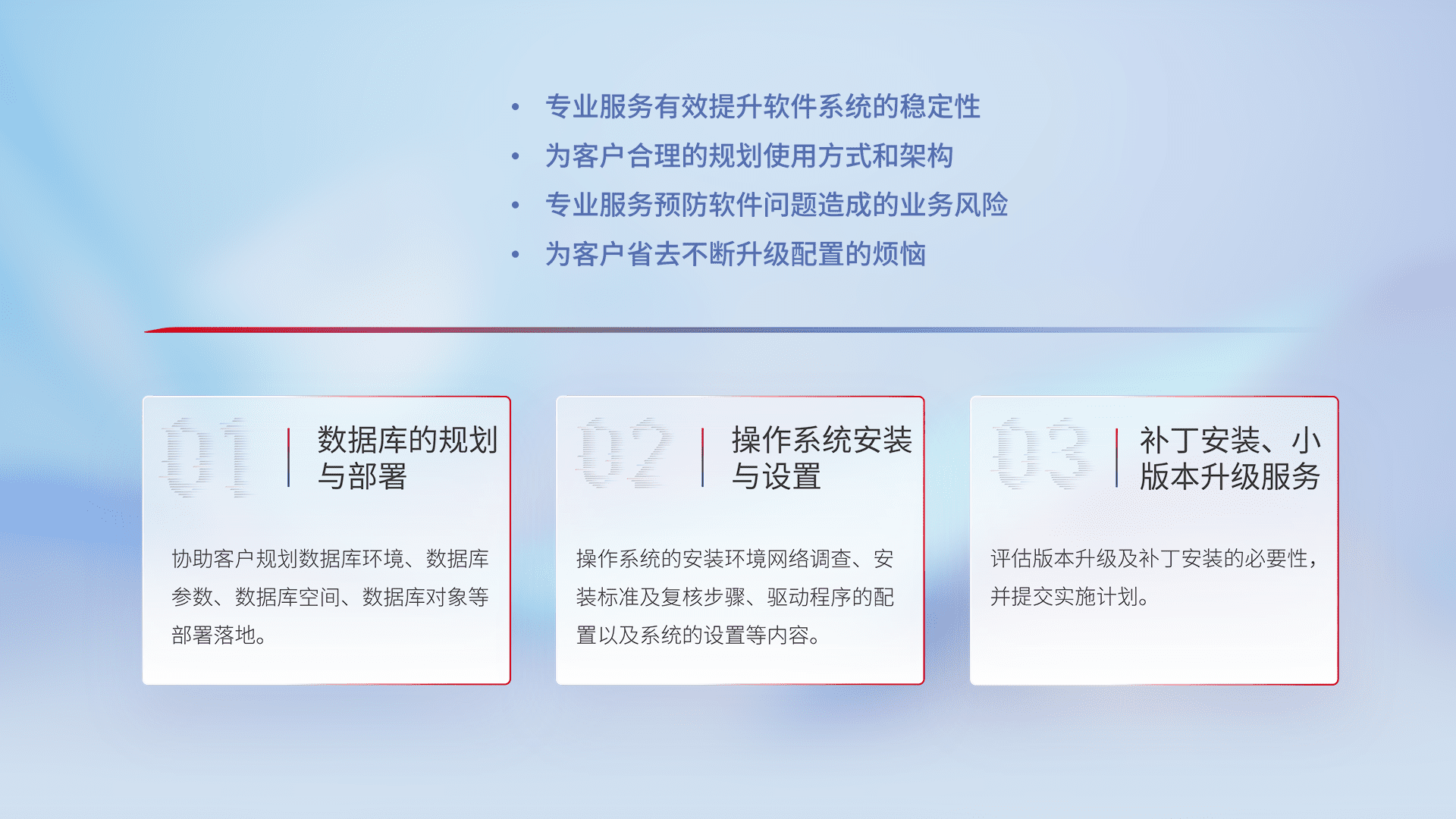 为客户提供软件规模升级、、、快速部署、、、、按需配置的专业服务,,,从数据库的规划与部署到操作系统的安装与设置,,,再到补丁安装和小版本升级提供支持。。
