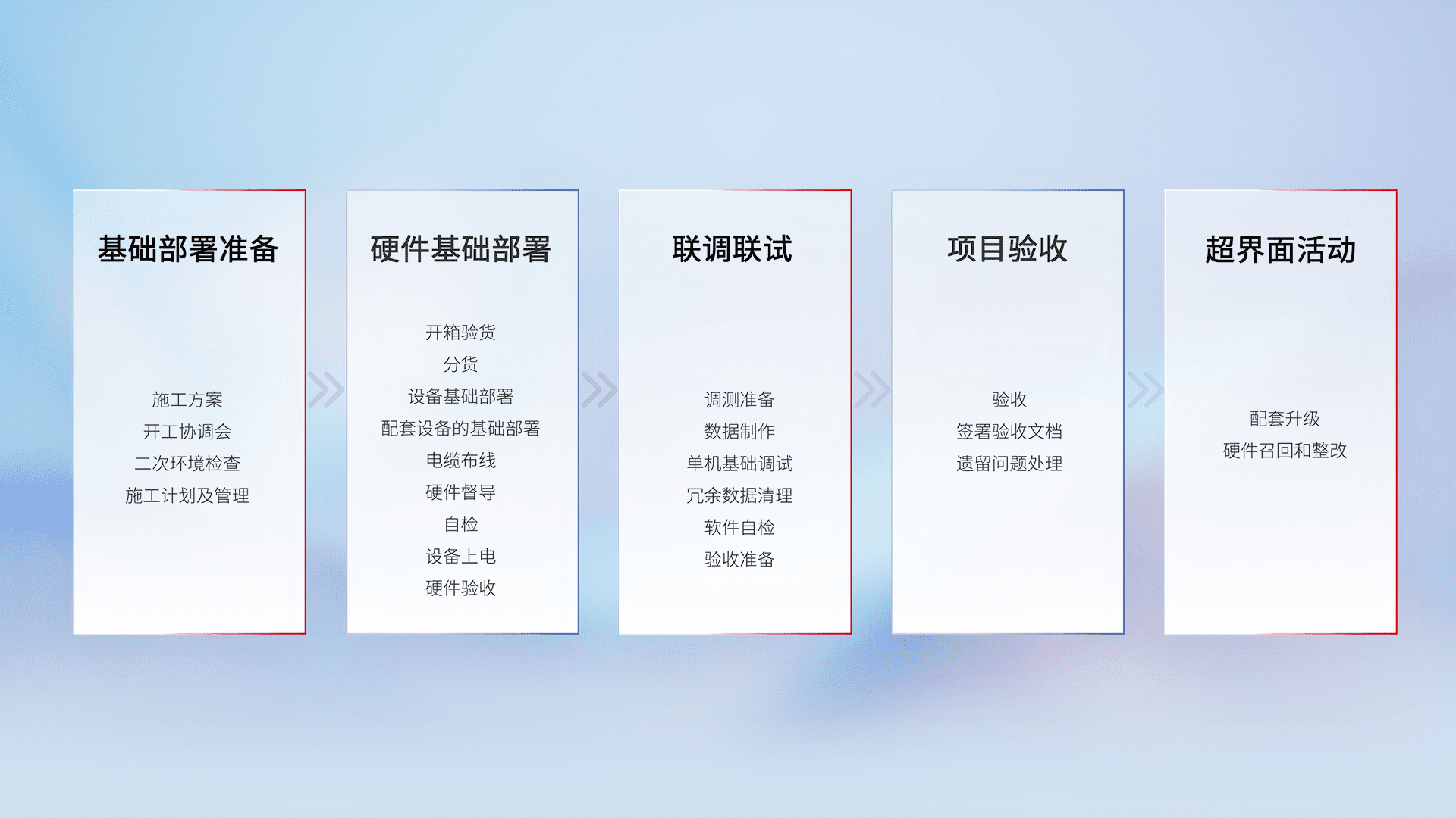 从基础部署准备、、、硬件基础部署、、、联调联试、、项目验收、、、、越界面活动的全过程可追溯,,,保证施工质量和进度。。